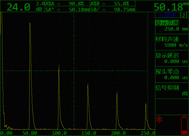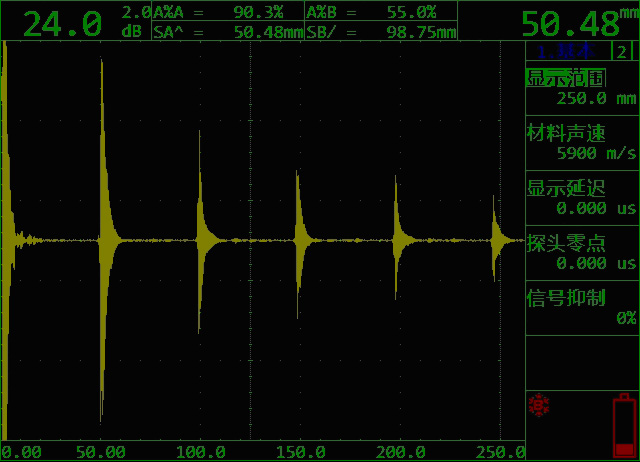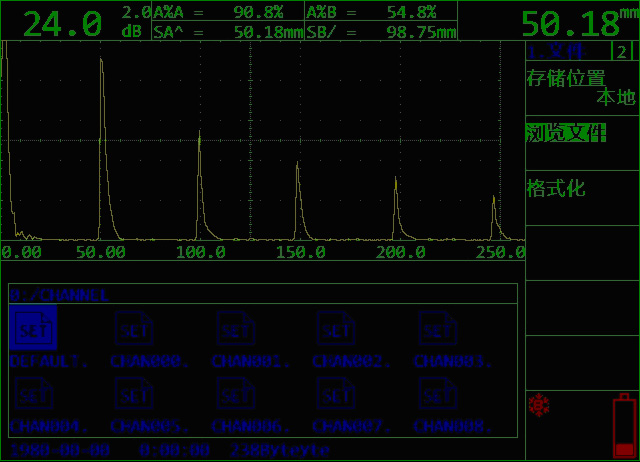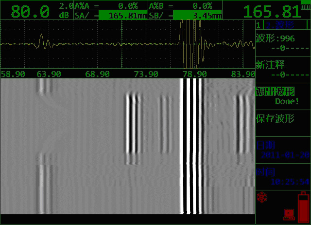 支持灰度B掃功能,可顯示截面灰度B掃描,一個屏幕顯示豐富信息量,可用于簡單TOFD應用。(下圖為灰度B掃功能顯示圖)