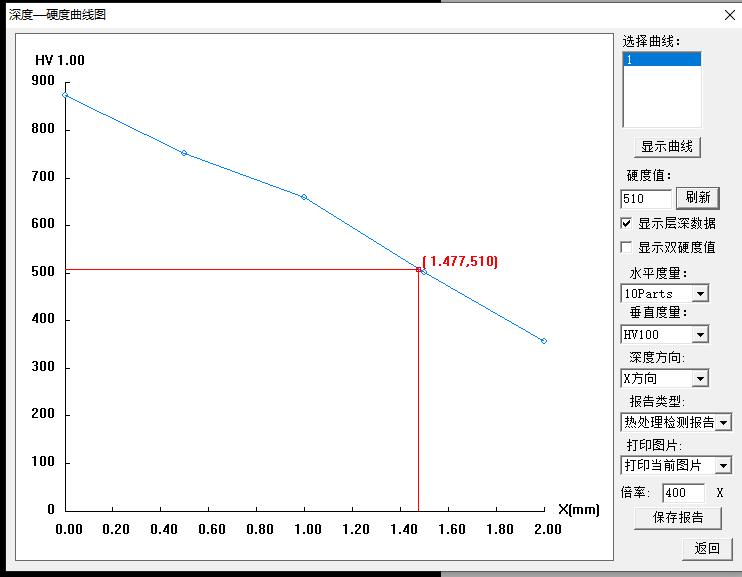 l 層深曲線:根據(jù)測量數(shù)據(jù)繪出硬度-深度曲線,可輸出雙硬度曲線圖(HV和HRC/HRA等)。